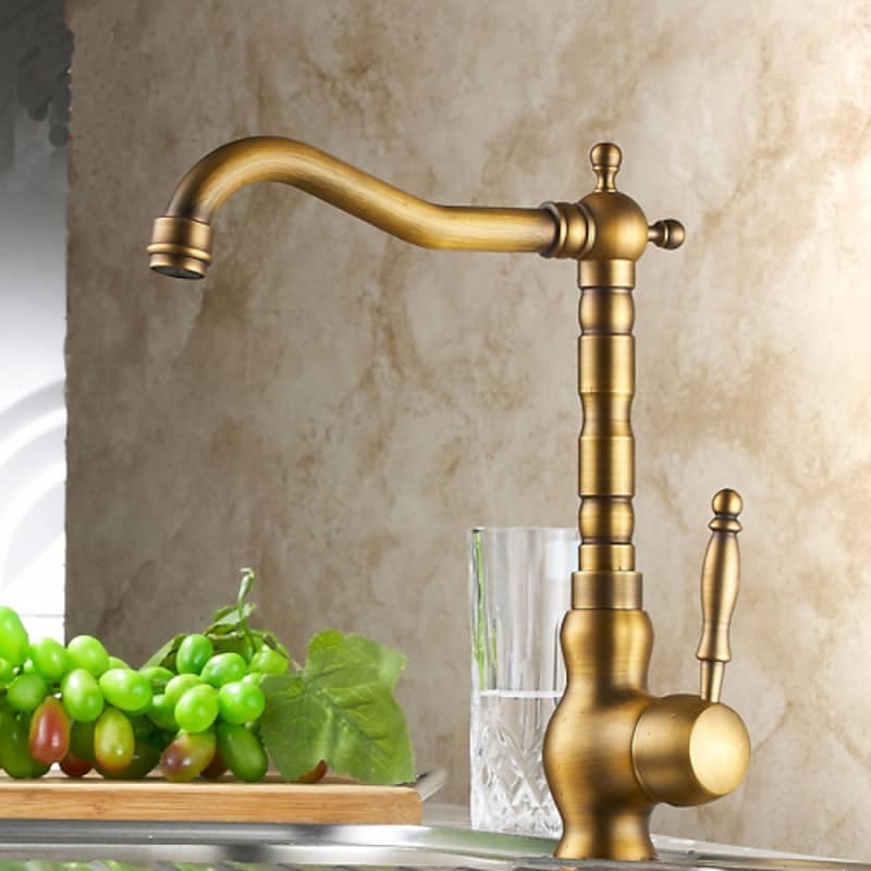 Typ:Standardowa wylewka,Styl:Współczesny,Cechy:Obrotowy,Typ kranu:Kuchenny,Typ instalacji:Montaż na blacie,Liczba uchwytów:Pojedynczy uchwyt,Przepływ (l/min):#(1,8 GPM (6,81 l/min)),Przełącznik zimna i ciepła:Tak,Typ zaworu:Zawór ceramiczny,Wykończenie:Antyczny mosiądz,Otwory montażowe i uchwyty:Jeden otwór,Pojedynczy uchwyt, jeden otwór,